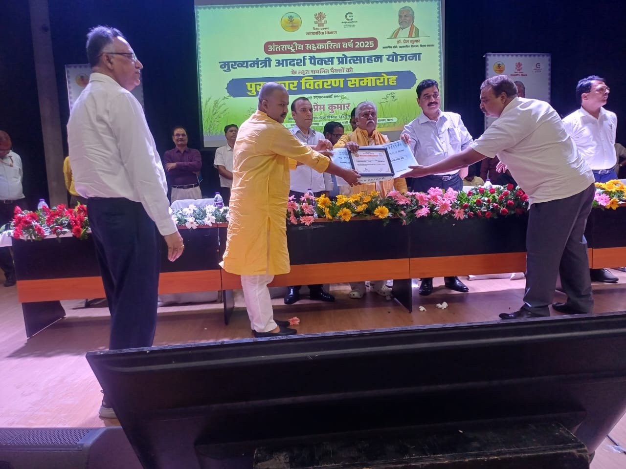 दो पैक्स अध्यक्षों को सहकारिता मंत्री प्रेम कुमार ने किया पुरस्कृत